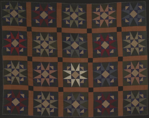 Made shortly before 1900, this pattern features an eye-catching light star surrounded by darker shaded stars. The bright orange setting strips invite each star to stand alone. Sisters Jesse and Ruth used wool and heavy cotton clothing scraps to piece this graphic work of art. Women named and used patterns to express their political views. This pattern represents the turmoil between Britain and the United States over the Oregon Territory boundary, now the northern boundary of Washington State. An 1846 treaty settled on the 49th parallel precisely established by a survey in 1860.